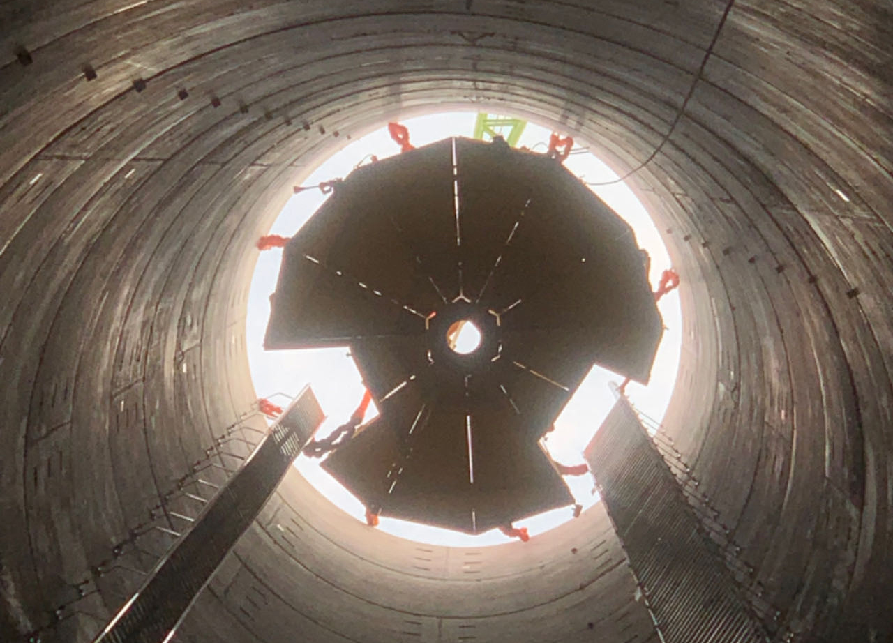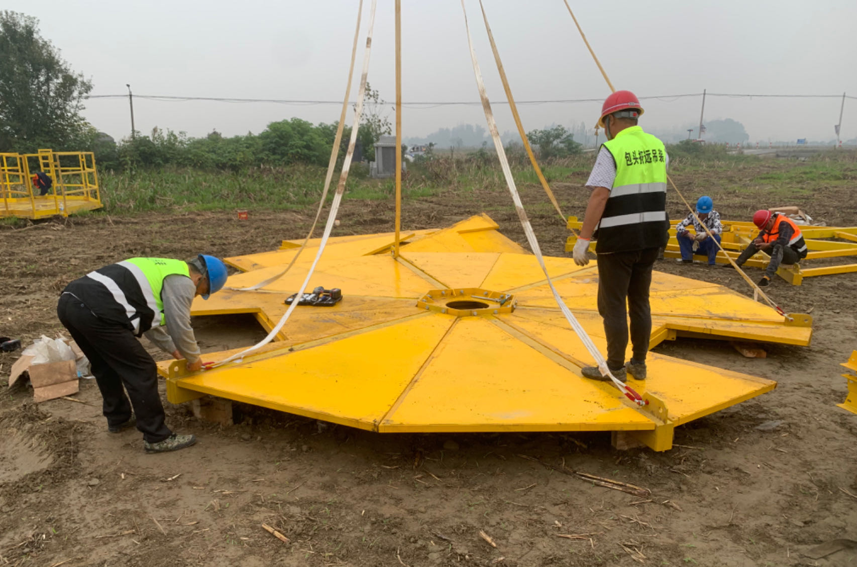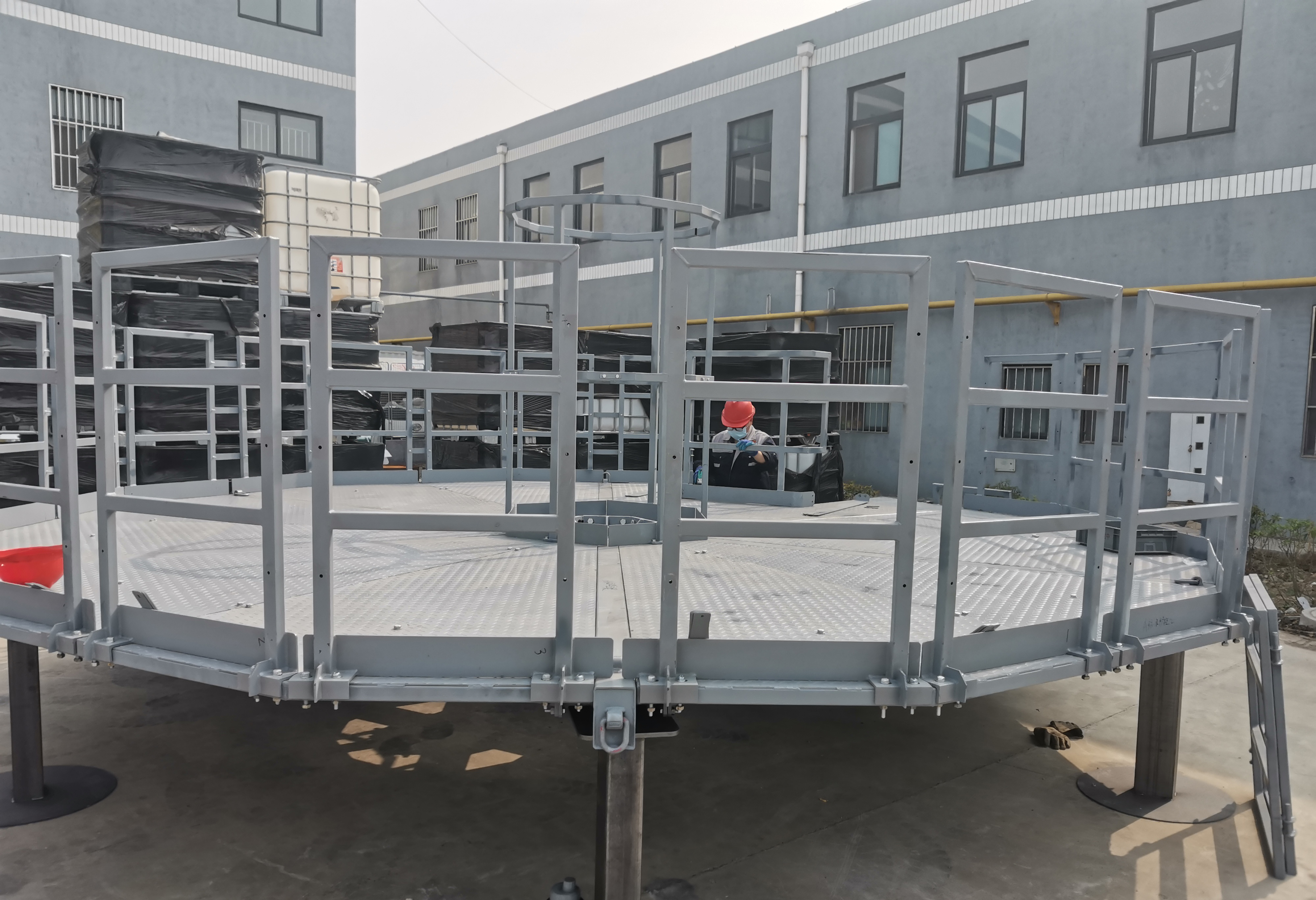 混塔施工平台应用于混凝土塔筒的环段吊装作业,是能够随筒节直径变化的载人与物料的作业平台,可满足每段混塔的安装施工,主要包含涂抹环氧树脂、混塔水平度测量、垂直度测量等作业需求,方便施工。
